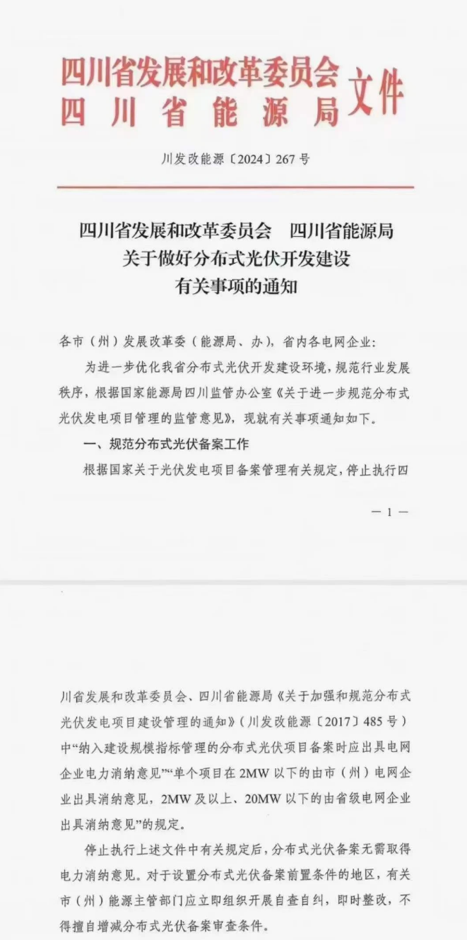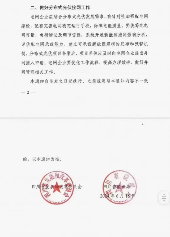 6月15日,四川省发展改革委、四川省能源局联合印发《关于做好分布式光伏开发建设有关事项的通知》(川发改能源〔2024〕267号),要求各市(州)发展改革委(能源局、办)开展自查自纠,即时整改,不得擅自增减分布式光伏备案审查条件,要求电网企业有针对性地加强配电网建设,优化工作流程,提高办理效率,做好并网管理相关工作。